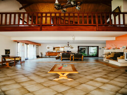À l'étage, une mezzanine de 36 m² surplombe le séjour et offre un véritable second espace de vie. S'ajoutent quatre chambres supplémentaires, un bureau de 17 m², une salle de bains, un WC et des rangements.
