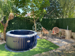 Extérieurs soignés et intimistes L'accès à la maison se fait par un grand portail occultant, ouvrant sur une vaste cour permettant de stationner 4 à 5 véhicules. Le jardin propose un espace agréable avec coin barbecue, spa, et un puits. Des espaces verts communs entre les habitations apportent une respiration supplémentaire.