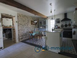 Nichée au calme dans un environnement champêtre, cette maison en pierre offre aujourd'hui une habitation d'environ 160 m², ses dépendances, un pigeonnier et un terrain arboré d'un hectare. L'habitation se compose d'une entrée avec dégagement, une cuisine aménagée et équipée, un salon chaleureux et authentique, séduit par ses poutres apparentes, sa cheminée avec insert. Depuis la cuisine et le salon, on accède à une grande terrasse bénéficiant d'une vue imprenable sur la campagne environnante. Au même niveau, une chambre avec salle d'eau, un WC indépendant et une véranda. A l'étage, un dégagement distribue deux chambres, une salle de bain et un WC indépendant. Au rez-de-jardin, une seconde pièce à vivre d'environ 40 m² dispose d'une cheminée, d'un coin cuisine et d'une salle d'eau. Cet espace offre de nombreuses possibilités : chambre, bureau, salle de loisirs ou studio indépendant. Dépendances : grange, caves, pigeonnier. De nombreux travaux récents ont été réalisés : mise à jour de l'électricité, amélioration de l'isolation, toiture de la grange rénovée, installation de panneaux photovoltaïques et mise aux normes de l'assainissement individuel. Le charme authentique de la pierre s'y conjugue avec une localisation idéale, alliant calme, proximité des services du quotidien et des principaux axes. (TGV, autoroute, RCEA etc...) Je suis à votre disposition pour tout renseignement complémentaire ou organiser une visite.