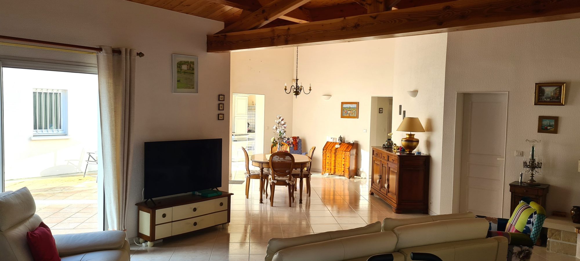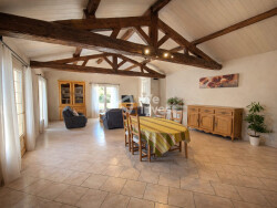 Elle se compose d'une belle pièce de vie cathédrale lumineuse avec poutres apparentes, d'une cuisine indépendante mais ouverte, de 2 chambres, d'un bureau, d'une grande salle de bain avec baignoire, douche à l'italienne et WC, d'une arrière-cuisine / buanderie, ainsi que d'un WC séparé.