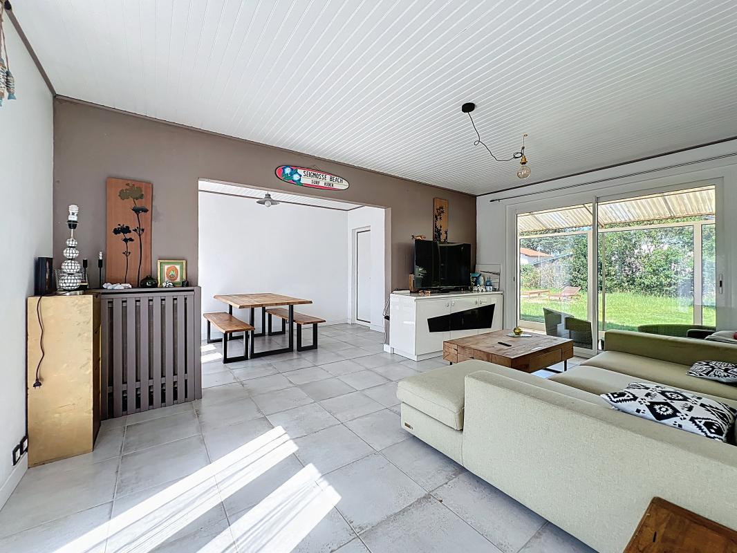 Maiosn a vendre à Seignosse bourg - La maison en plain-pied, se compose de 5 pièces spacieuses et lumineuses, un séjour double, une cuisine équipée, 3 chambres, une salle d'eau, et un WC indépendant. Une terrasse et une véranda. Un garage et un local technique. Située dans une impasse, sur un terrain entièrement clos de 800m².
