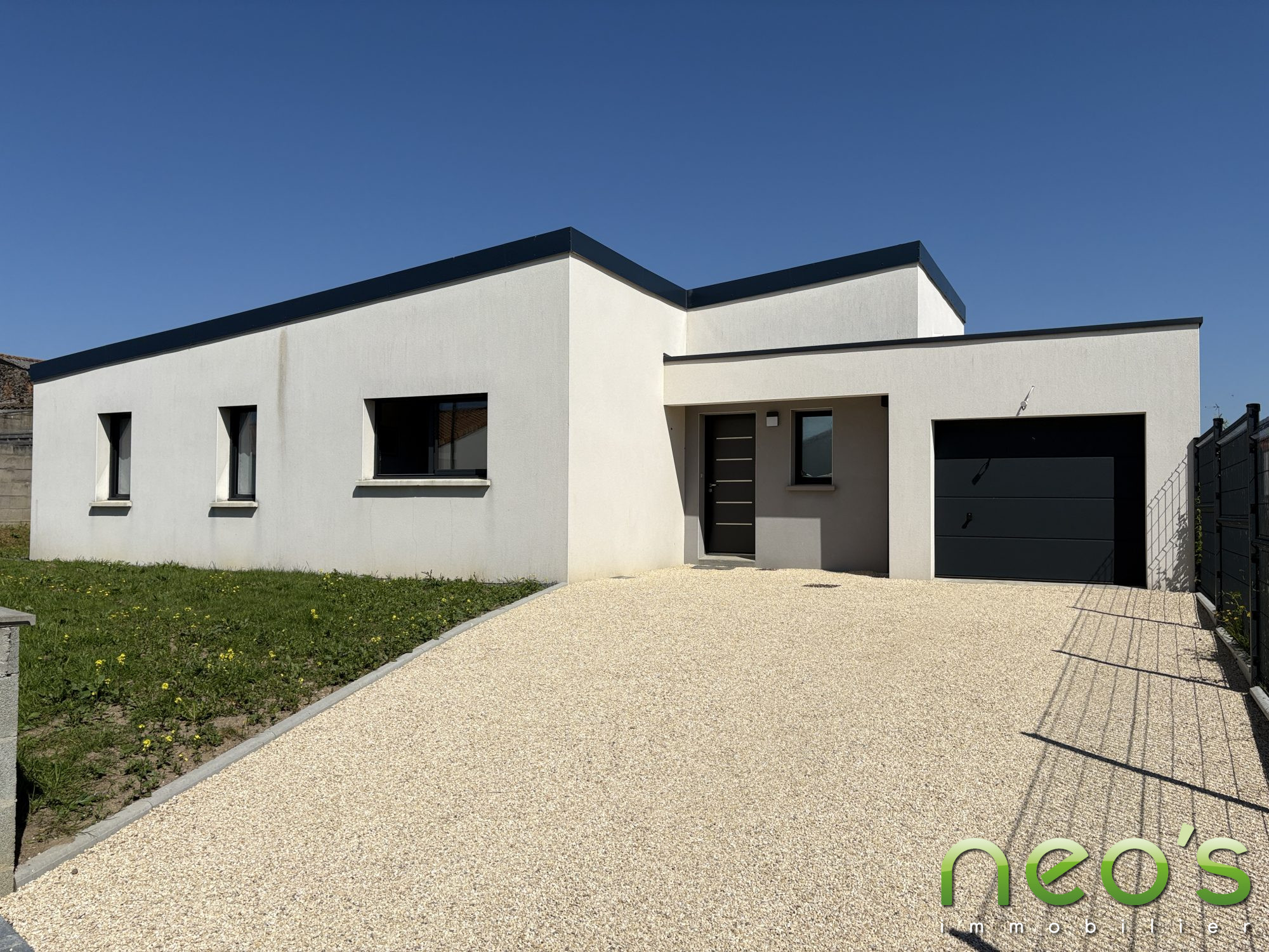 10 MIN ST MACAIRE EN MAUGES Sur la commune de VILLEDIEU LA BLOUERE, Maison de 2025, 80 m² habitables offrant : Hall d'entrée, pièce de vie avec cuisine aménagée et équipée, dégagement, 2 chambres, SDE, deuxième dégagement, troisième chambre, lingerie et garage. Terrain clos de 440 m² avec terrasse. Normes RE 2020, chauffage aérothermie au sol.
