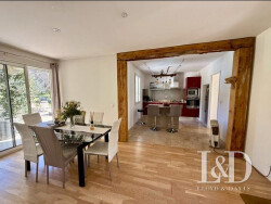 Au rez-de-chaussée: une chambre de plain pied, une salle de bain, WC, cuisine / salle à manger ouvrant sur une terrasse couverte côté piscine. Le vaste séjour lumineux donne sur une grande terrasse de 131 m², un espace idéal pour profiter en famille ou entre amis de moments conviviaux sous la pergola. À l'étage sur un chaleureux sol en chêne, deux chambres cosy, avec chacune une terrasse, ainsi qu'une salle de bain. Derriere la véranda, le grand salon se prolonge sur un espace bureau/bibliothèque parfait pour le travail au calme. Pour un confort thermique optimal hiver comme été, la maison est entièrement climatisée et dispose de deux poêles à bois.