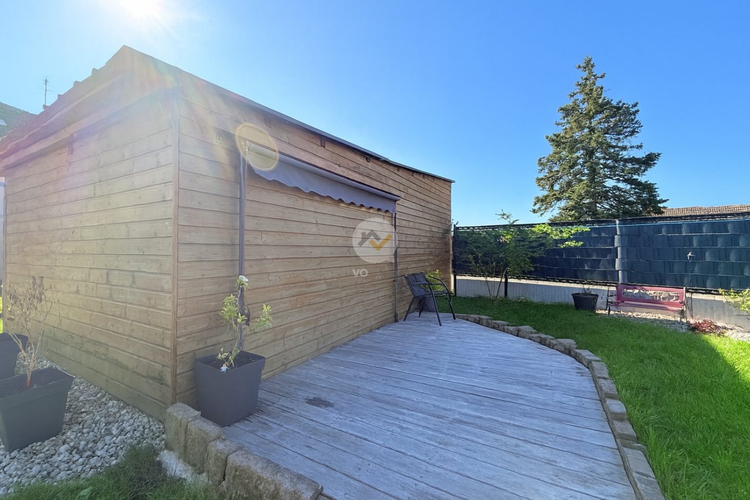 A l'extérieur vous trouverez un grand chalet en bois avec chauffage avec une terrasse ainsi qu'un double garage. Possibilité de garer 3 à 4 voitures dans la cour.