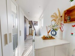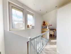 A l'entrée un couloir dessert un séjour, une cuisine ouverte sur une terrasse d'environ 21m², un coin salle manger et un WC avec fenêtre. A l'étage un bel espace avec couloir et bureau, une chambre parentale avec salle de bain, baignoire balnéo, douche et WC, ainsi qu'une petite pièce attenante.
