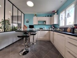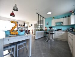 Maison contemporaine de plain pied de 2014, très lumineuse, calme et résidentiel, proche de toutes les commodités, vaste salon séjour avec cuisine ouverte équipée, 2 chambres, douche italienne, dressing, garage, terrasse et jardin clos.
