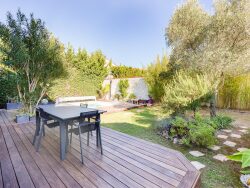 À l'extérieur, le jardin paysager, sans vis-à-vis, accueille une piscine chauffée de 4x4 mètres équipée d'un volet de protection, une grande terrasse en bois abritée par un store électrique, un puits ainsi qu'un garage. Il est également possible de stationner un véhicule supplémentaire sur la parcelle, équipée d'une borne de recharge électrique.
