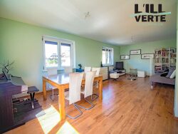 ** EXCLUSIVITE L'ILL VERTE ** ** COUP de COEUR ** Idéalement située au coeur du quartier historique de Vendenheim, dans une rue à sens unique hyper calme, en seconde ligne et dans un écrin de verdure, spacieuse maison fraichement rénovée, avec 5 pièces, et 140m² au sol, sur un beau terrain intime de 5.45 ares. Elle est composée au 1er niveau d'une belle entrée, un grand espace de vie de 34.40m² sur une cuisine ouverte équipée de 13.70m², une chambre de 12m², un WC indépendant et un dégagement central avec un poêle à pellets. L'étage vous offre trois grandes chambres de 15m², 16m² et 17m² au sol, une superbe salle de bains avec douche, baignoire balnéo et WC, et un dégagement avec un accès aux combles isolés au sol. Le sous-sol est total avec cave, buanderie et garage avec porte automatique. Vous profiterez en extérieur d'un parking couvert, d'une cour pouvant accueillir quatre voitures et d'un grand jardin intime exposé Sud avec potager.