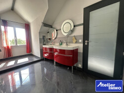 L'étage se compose d'une superbe mezzanine de 35 m² offrant plusieurs possibilités, une chambre de , une salle de bains avec balnéo et un WC indépendant.