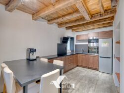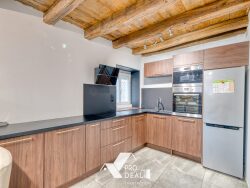 L'entrée donne sur la pièce de vie avec sa cheminée à foyer fermé, la cuisine attenante est indépendante, aménagée et équipée. Vous trouverez également une buanderie / cellier avec un espace chaufferie et un WC indépendant.
