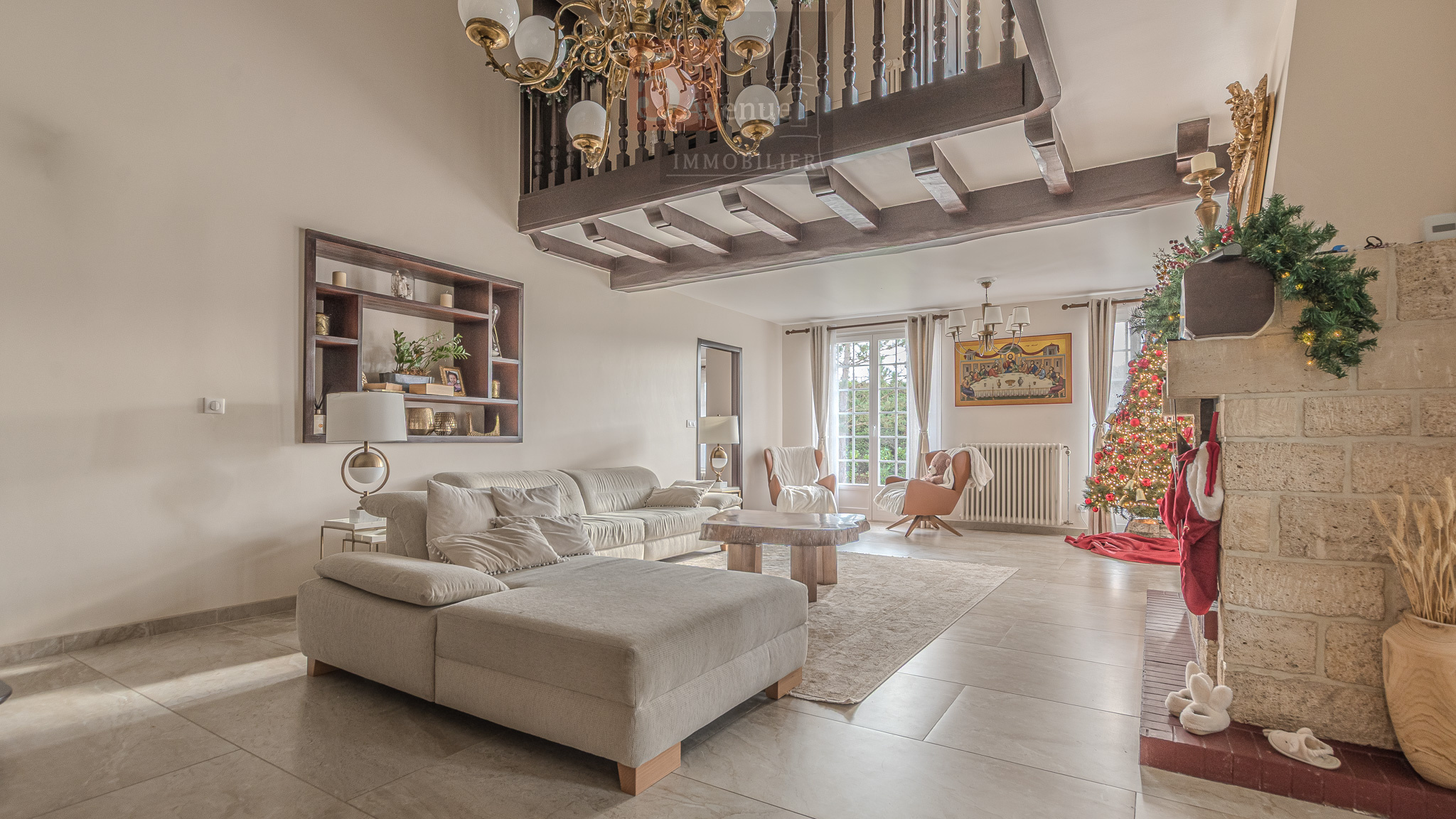 Vaste entrée distribuant d'un côté un grand salon lumineux et un deuxième salon intimiste donnant sur le jardin. A l'opposé une cuisine familialle entièrement équipée ainsi qu'une buanderie et une cave voutée.