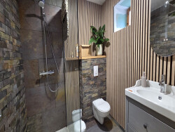Rez de chaussée : Une cuisine équipée, un grand séjour cathédrale avec mezzanine, un salon avec poêle à granulé, une buanderie, une salle d'eau avec un wc, un cellier et un wc séparé.