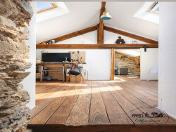 Dès l'entrée, la maison vous accueille dans une atmosphère chaleureuse et pleine de charme avec son sol ancien et ses beaux volumes ouverts. Le rez-de-chaussée se compose d'une grande pièce à vivre de 40m², de 2 grandes chambres et une salle de bains. L'étage propose les mêmes prestations avec ses murs en pierres, son parquet massif et les jolies fermettes laissées apparentes. Ses beaux volumes sous combles sont aujourd'hui 1 chambre, un espace nuit et un bureau.