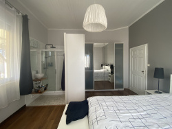 - Authenticité & Confort : Maison atypique avec de très grandes fenêtres d'époque, enduits intérieurs traités anti-allergènes, menuiseries PVC double vitrage. - Espace & Fonctionnalité : Salon chaleureux avec poêle à bois et climatisation, salle à manger séparée, 5 chambres, dont 3 en rez-de-chaussée et une suite parentale de 21 m2. - Grande salle de bains avec douche, baignoire d'angle, double vasque et WC, plus un WC séparé.- Cuisine spacieuse séparée, buanderie/chaufferie pour plus de praticité. - Chauffage performant avec chaudière à gaz récente DPE en C pour une bonne efficacité énergétique.