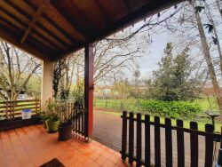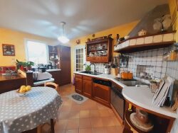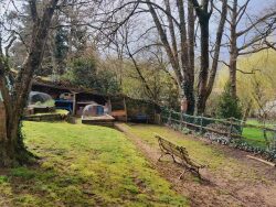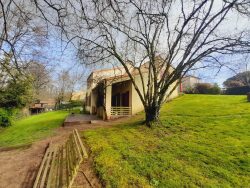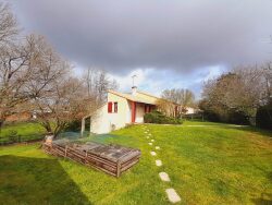 Proche du bourg, dans un écrin de verdure, maison atypique de 120 m² hab. composée d'une entrée spacieuse, salon avec cheminée, cuisine A/E, 3 chambres, salle d'eau, wc, débarras et cave. Garage indépendant. Un joli terrain clos et arboré d'environ 1 306m².