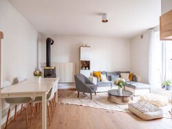 Elle s'ouvre sur le rez-de-chaussée qui dessert un grand salon séjour d'une surface de 23 m2 agrémenté d'un poêle à bois et d'un parquet, idéal pour des moments conviviaux en famille ou entre amis. Ce niveau propose également une cuisine entièrement équipée et indépendante, une salle d'eau avec douche à l'italienne, vasque et un espace buanderie ainsi que des toilettes séparées.