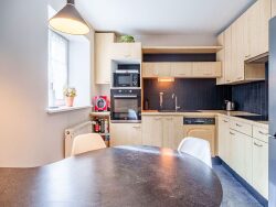 Elle s'ouvre sur le rez-de-chaussée qui dessert un grand salon séjour d'une surface de 23 m2 agrémenté d'un poêle à bois et d'un parquet, idéal pour des moments conviviaux en famille ou entre amis. Ce niveau propose également une cuisine entièrement équipée et indépendante, une salle d'eau avec douche à l'italienne, vasque et un espace buanderie ainsi que des toilettes séparées.