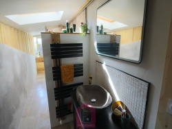 Elle se compose d'une entrée par véranda lumineuse, idéale pour profiter du paysage, donnant accès à une spacieuse cuisine équipée avec îlot central. L'espace nuit comprend une chambre avec dressing (parquet au sol), ainsi que deux autres chambres desservies par un large couloir. Une salle de bains avec WC, entièrement rénovée en pierre de Turquie, complète ce niveau. Possibilité d'aménager une grande partie des combles selon vos besoins. En rez-de-chaussée, vous bénéficierez d'un appartement indépendant de type 2 pièces à terminer, comprenant une entrée par couloir, un espace prévu pour la cuisine avec raccordements, une salle d'eau avec WC, un séjour et une chambre. Le bien dispose également d'un double garage, du tout-à-l'égout, d'un chauffage central avec chaudière à bois, de menuiseries en double vitrage et d'un jardin en espalier. Des travaux de finition sont à prévoir, offrant un beau potentiel de personnalisation. 'Les informations sur les risques auxquels ce bien est exposé sont disponibles sur le site Géorisques : www.georisques.gouv.fr'.