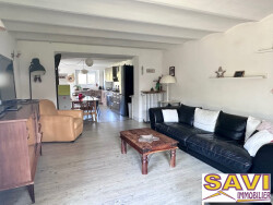 D'une surface de 125m² habitables environ répartie sur 3 niveaux, elle dispose d'une première entrée s'ouvrant sur une vaste pièce de vie chaleureuse avec son poêle à granule et conviviale avec sa cuisine ouverte aménagée et équipée, plusieurs ouvertures accèdent directement au jardin.