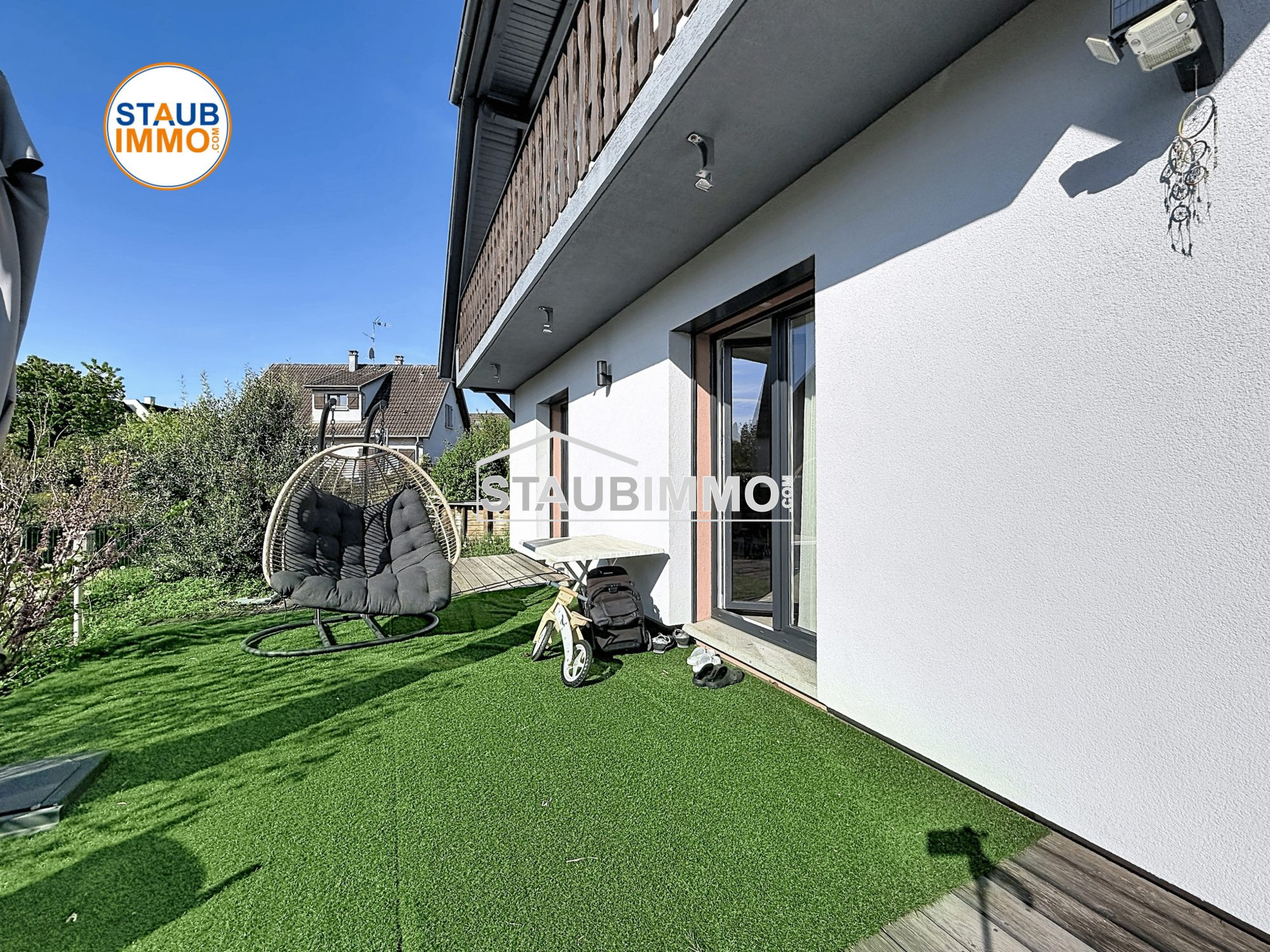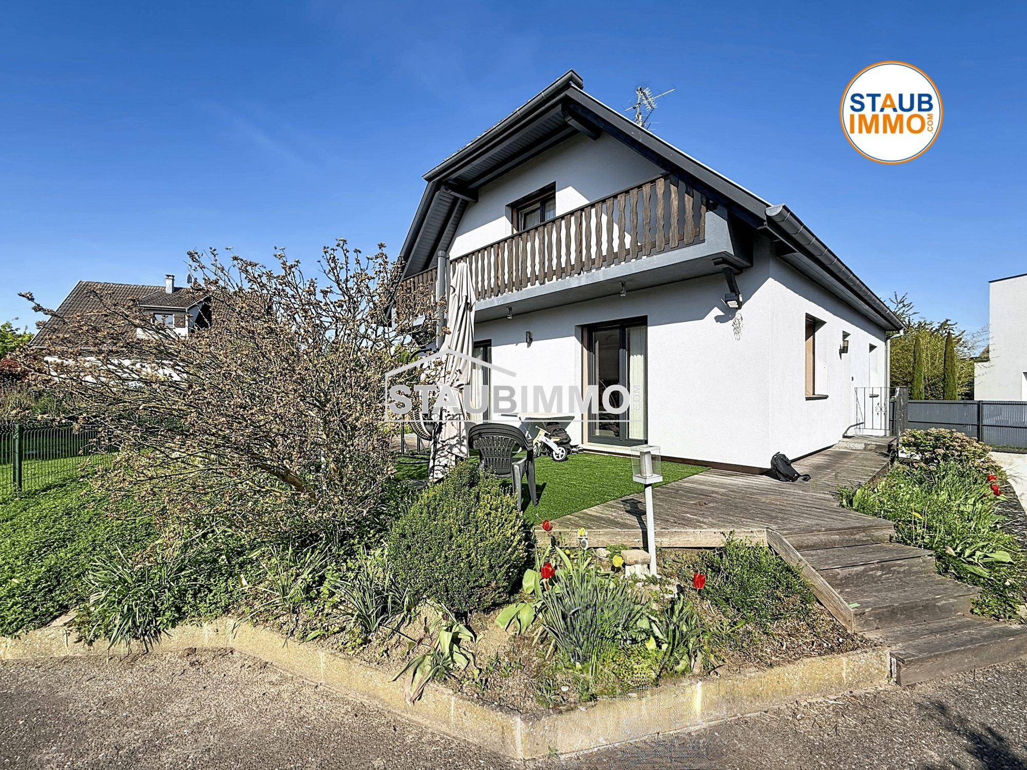 Blotzheim 68730 Beautiful house in a quiet area 134 m² floor area 5.29 ares of land Located in a peaceful cul-de-sac, this 1990s house, fully renovated in 2024, offers 115 m² of living space (134 m² total floor area) and is in excellent overall condition. Ground floor: Welcoming entrance hall One bedroom Separate fitted and equipped kitchen Spacious and bright living-dining room with fireplace opening onto a pleasant terrace First floor: Two lovely bedrooms, one with built-in wardrobe and balcony Bathroom with shower Full basement: Technical room / laundry Cellar Multi-purpose room (office, playroom, gym, etc.) Double garage Outside: Three private parking spaces Enclosed and landscaped garden of 5.29 ares Additional features: electric heating, water softener, quiet residential environment. A rare property in this area perfect for a family seeking comfort, peace, and practicality.