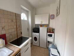 Une entrée avec rangements desservant un séjour lumineux, WC séparé, l'accès à la cave et une cuisine séparée équipée. Accès à l'extérieur, terrasse dallée et établi dans la cour.
