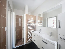 A l'étage l'espace nuit se compose de deux chambres de 18 m² et 20 m², toutes deux équipées de placards de rangement. et de leur salle d'eau indépendante.