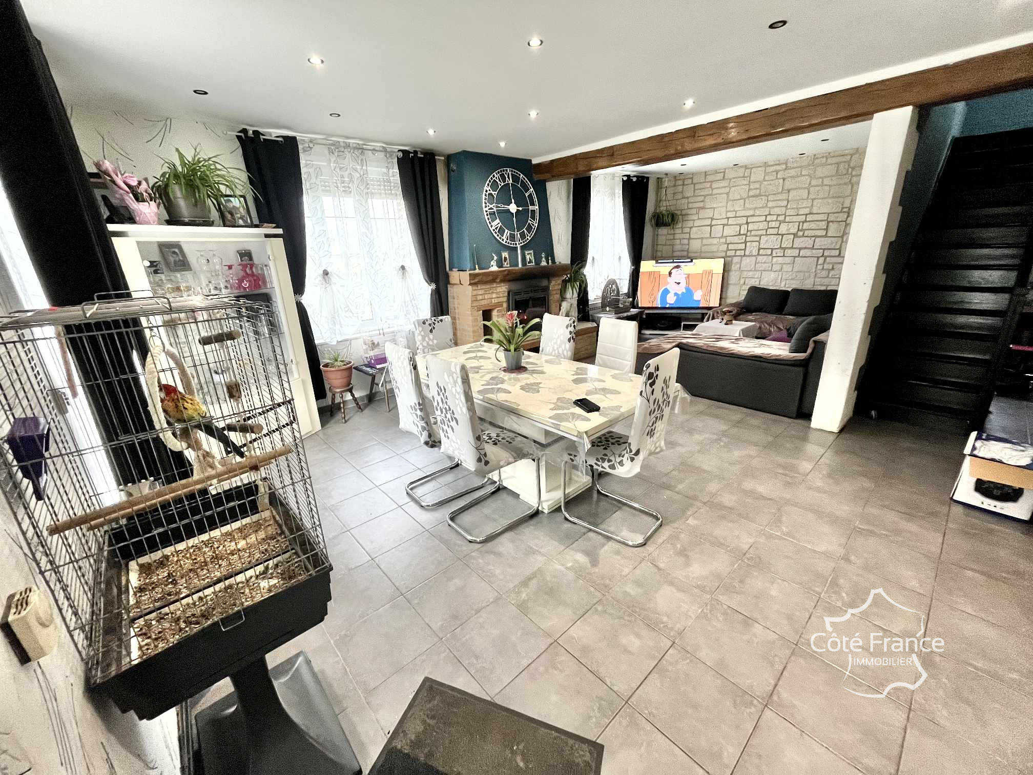 Elle se compose ainsi : Au RDC : une entrée, une cuisine ouverte, une salle à manger, un salon d'environ 32 m2, une salle de bain, un wc. Au 1er étage un palier dessert 3 chambres et un bureau (ou une petite chambre).