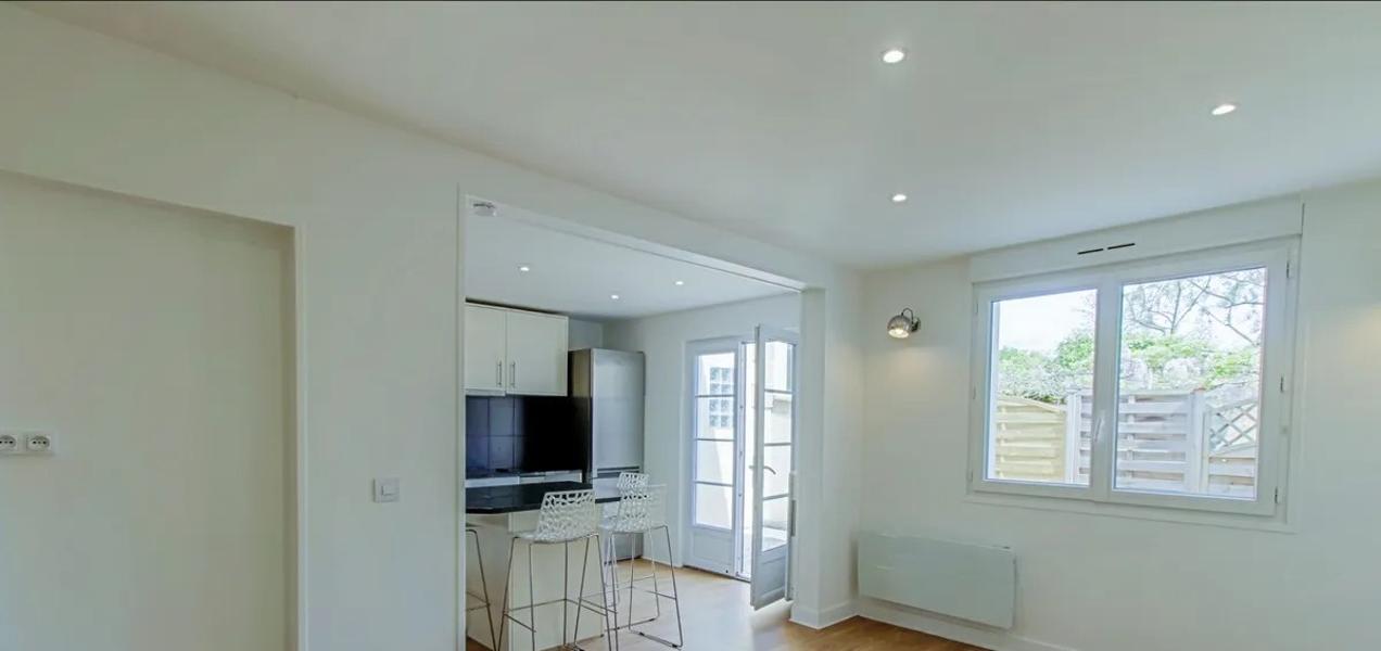 Maison individuelle de plain pied avec grand jardin et garage.