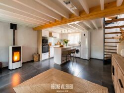 Régine Villedieu Immobilier, agence immobilière à Cherbourg vous propose : Agréable maison en pierres, située sur les hauteurs de Cherbourg comprenant : Au rez-de-chaussée : Une grande pièce de vie. Au premier étage : Un palier desservant une chambre, un bureau, une salle d'eau et sanitaires. En souplex : Une belle cuisine aménagée et équipée ouverte sur salle à manger avec poêle à granulés, une véranda et une chaufferie avec sanitaires. Un jardin arboré et clos avec 2 cabanons derrière la maison. Profitez d'un accès secondaire au fond du jardin ouvrant sur un chemin : un atout majeur pour rentrer vos vélos facilement après vos balades. À 11 min de NAVAL GROUP / Cherbourg-en-Cotentin À 22 min d' ORANO / La Hague À 28 min de l' EPR / Flamanville