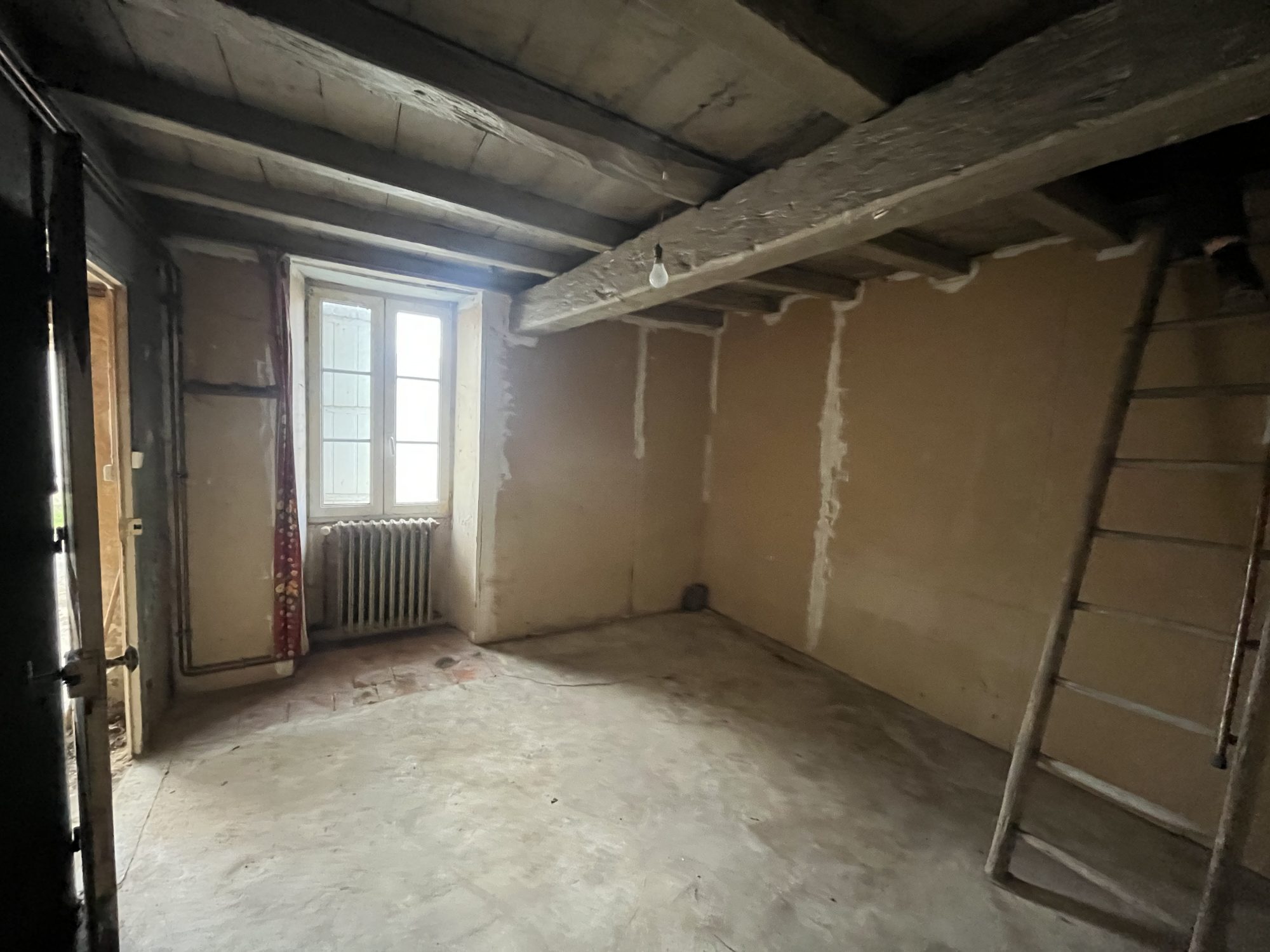 Maison d'habitation de 100 m² comprenant à l'étage : Entrée dans couloir avec placards- Cuisine aménagée (10.7 m²)- Séjour/ salle à manger (26.14 m²) avec insert bois, une baie vitrée ouvrant sur un balcon - 3 chambres (10.1 m², 10.2 et 11.75 m² avec placards) - Salle d'eau (6.2 m²)- WC. (travaux de finition à prévoir avec le remontage des radiateurs qui ont été repeints).
