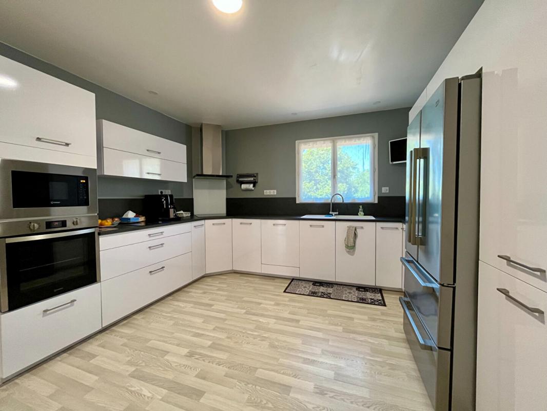 Au rez de chaussée une entrée dessert une pièce de vie avec salle à manger surplombée d'une mezzanine. Deux marches mènent au salon avec un insert et vue sur le parc et la piscine. L'architecture de cette pièce est un des atouts charme de la maison. La cuisine est indépendante.