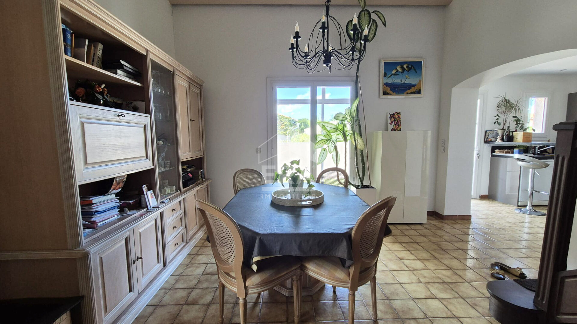 Un séjour lumineux avec cheminée et salle à manger, idéal pour des soirées chaleureuses