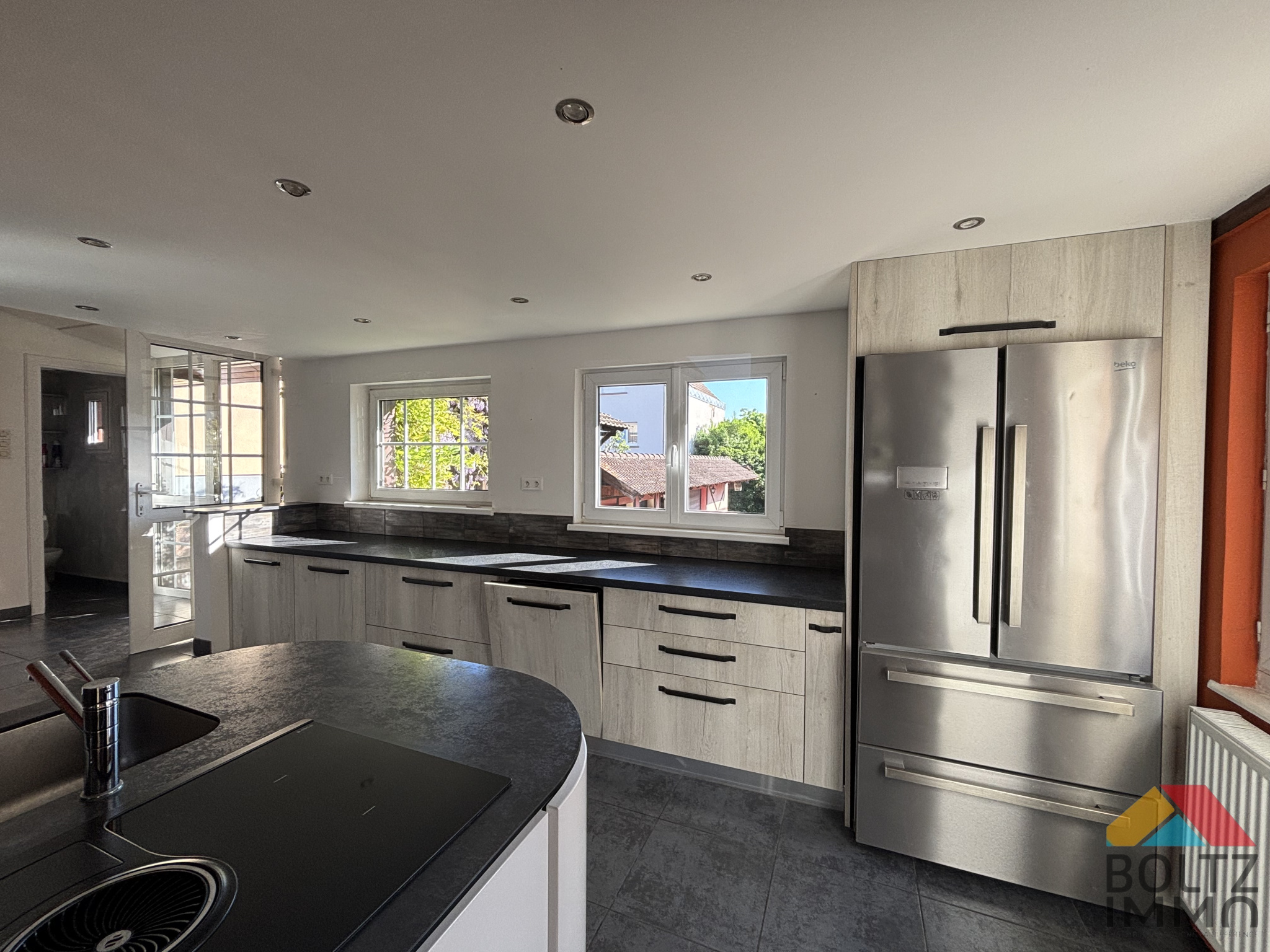 Maison bi-famille 255 m² habitables Terrain 6,80 ares 2 garages, cave Quartier calme à Benfeld Adresse : Rue de Markolsheim, Benfeld quartier résidentiel recherché Surface : 255 m² habitables (193 m² au sol pour le duplex) Terrain : 6,80 ares Stationnement : 3 places de parking extérieures + 2 garages Sous-sol : une cave spacieuse Description du bien : Maison composée de deux logements indépendants, idéale pour un projet familial ou mixte résidence principale + investissement locatif. Logement en rez-de-chaussée env. 100 m² (actuellement loué)