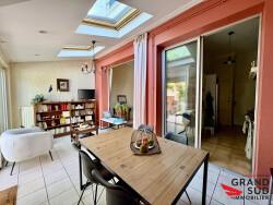 Dès l'entrée, vous serez séduits par l'atmosphère chaleureuse de cette pièce de vie traversant de 52 m², baignée de lumière grâce à de grandes baies vitrées qui ouvrent sur un extérieur paysagé de 80 m².