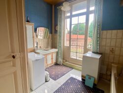 L'escalier vous mène au premier étage, où vous trouverez trois belles chambres, chacune offrant de beaux volumes et un cachet indéniable. Une salle de bains avec accès à un balcon complète cet étage, apportant confort et intimité.
