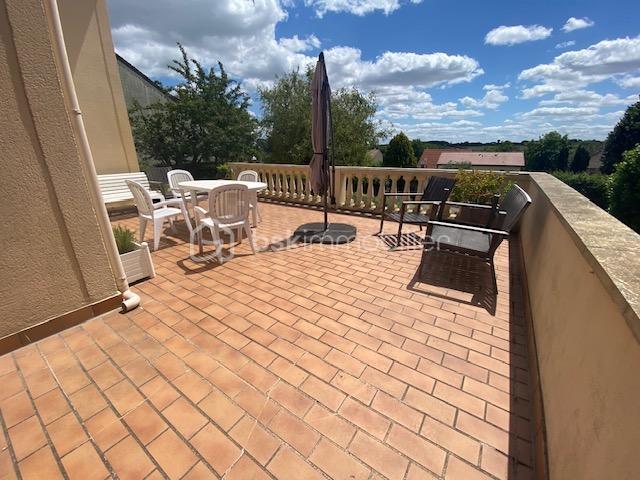 A l'étage , un appartement F5 comportant séjour de 38 m², cuisine meublée, 2 chambres, bureau et salle d'eau avec toilettes.