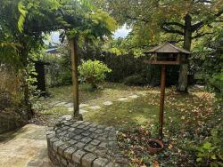 Terrasse pavée derrière et jardinet entièrement clos