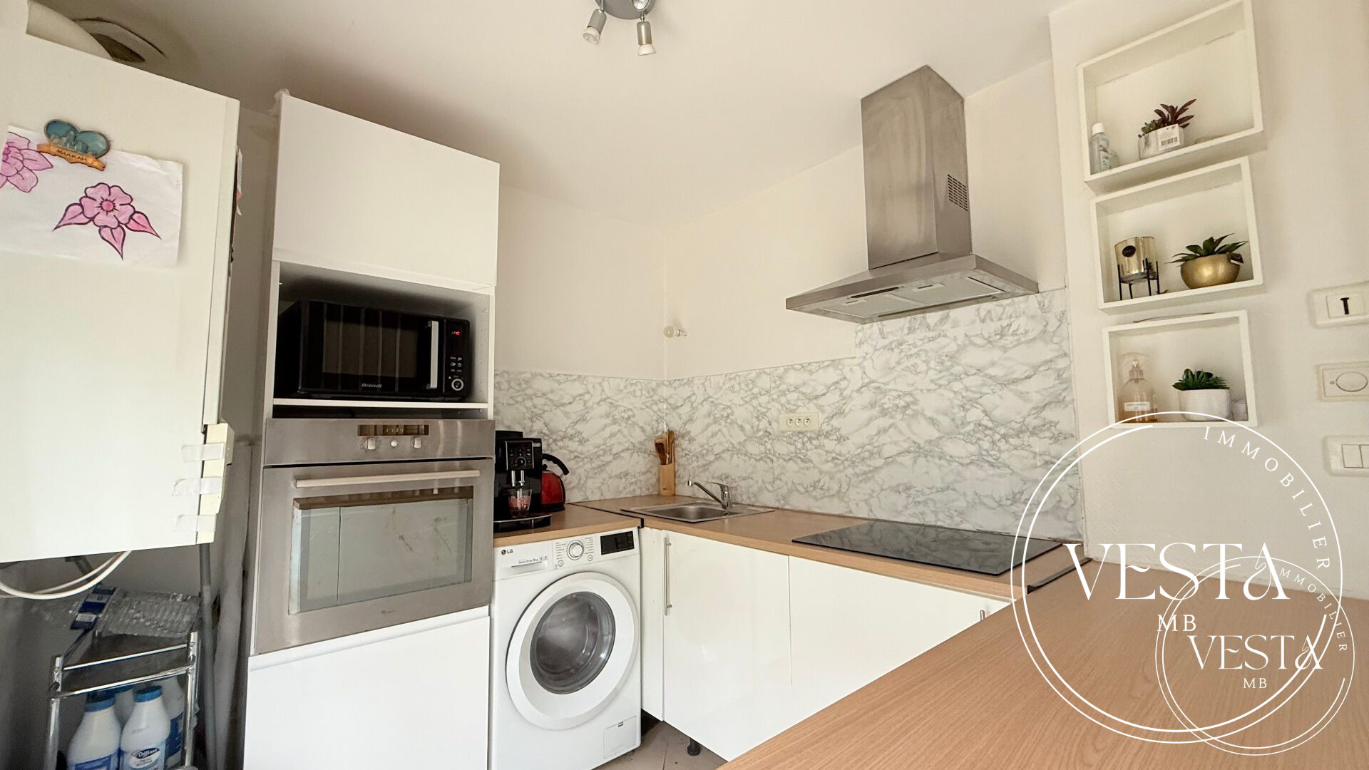 Du côté extérieur, une terrasse de 90m2 distribue salon et cuisine, le tout sur un terrain de 657m2. Le garage donne accès direct à la cuisine.