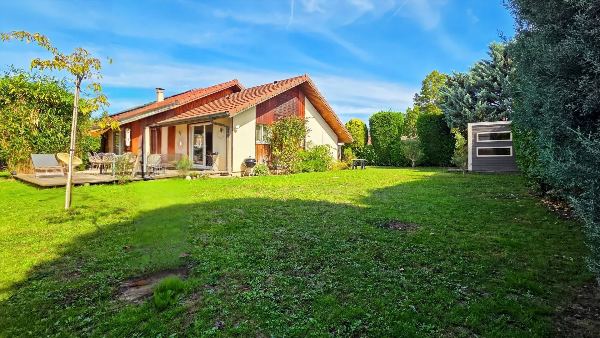 Située à Chens-Sur-Léman, à proximité immédiate du centre du village et avec un accès rapide à Genève, cette élégante maison bâtie en 1990 offre 165 m2 habitables, et près de 200 m2 utiles, sur un terrain paysager de 1000 m2. Le rez-de-chaussée propose une belle pièce de vie de 70 m2, lumineuse, avec salon cathédrale, poêle à bois et cuisine tout équipée, ouverte sur le séjour-salon. Une suite parentale de plain-pied complète ce niveau, avec chambre donnant sur le jardin par baies vitrées et salle de bains (douche et baignoire, double vasque), un wc séparé, cellier et une buanderie. A l'étage, trois chambres, une salle de bains, un wc séparé, des rangements et une grande mezzanine donnant sur le salon, pouvant servir de bureau, espace de jeux... PRESTATIONS DE QUALITE : baies vitrées triple vitrage, volets électriques, climatisation réversible dans chaque pièce, toiture refaite il y a 5 ans (décennale), buanderie, garage avec porte motorisée. A l'extérieur, un jardin accueille une superbe piscine 4/8 équipée d une pompe à chaleur et d'un rideau électrique, offrant un confort d'utilisation optimal et une parfaite sécurité. Un grand portail électrique de cinq mètres de long clot ce domaine. Une propriété de caractère, idéale pour une clientèle exigeante recherchant confort, volumes et proximité de Genève. - Annonce rédigée et publiée par un Agent Mandataire -