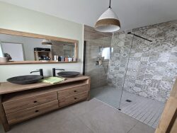 Imaginez-vous dans un séjour spacieux de 44 m², baigné de lumière naturelle grâce à ses grandes ouvertures en aluminium. La cuisine américaine, aménagée et équipée, est un véritable espace de vie convivial, parfait pour les repas en famille ou entre amis.