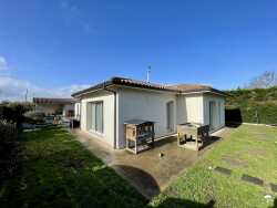 VIRELADE, à 3km de PODENSAC Maison contemporaine de 147 m² édifiée en 2015 comprenant: Une entrée indépendante donnant sur une lumineuse pièce de vie de 60 m² avec cuisine ouverte et équipée, un cellier + bureau de 7 m2, 1 chambre parentale de 24 m2 avec dressing et salle d'eau, 2 grandes chambres de 16 m2 avec salle d'eau attenantes, 2 toilettes. Chauffage au sol par pompe à chaleur et poêle à granulés.