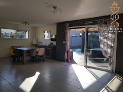 De même, vous apprécierez sa vie de plain-pied avec son vaste séjour salon d'environ 58 m2 en L, exposé Sud et Ouest, ouvert sur la terrasse bois prolongée d'une piscine chauffée, sa cuisine aménagée et équipée ouverte sur le séjour, deux chambres, salle de douche avec double vasques et WC indépendant, auxquels s'ajoute une suite parentale au-dessus du garage.
