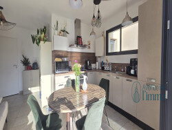 Maison contemporaine de 2020 comprenant : - RDC : entrée avec rangement, pièce de vie avec cuisine aménagée et équipée, WC, buanderie. - 1er étage : dégagement, trois chambres avec placards, WC, salle d'eau.