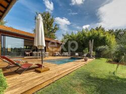 À l'extérieur, un jardin paysagé avec piscine et terrasse en bois prolonge l'espace habitable et valorise le bien pour un usage familial ou locatif saisonnier.