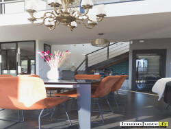 VOLUMES ET DESIGN Réception : Un double séjour de 50 m² sous plafond cathédrale, avec poêle à bois connecté. Cet espace de vie baigné de lumière s'ouvre de plain-pied sur un jardin exposé plein Sud. Cuisine & jardin d'hiver : Une cuisine semi-ouverte de 6,9m2, aménagée avec soin, se prolonge par une élégante véranda de 9.4 m², véritable salon d'hiver offrant une transition douce vers l'extérieur. Une buanderie/chaufferie et un grand garage avec borne de recharge pour véhicule électrique et deux stationnements extérieurs.
