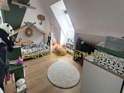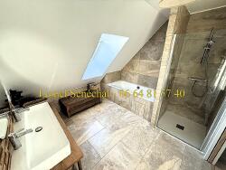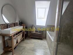 A l' étage, il y a une mezzanine qui dessert 3 chambres spacieuses (toutes de plus de 14 m2 au sol) avec rangements, une SDB (avec baignoire et douche italienne) et 1 WC indépendant.
