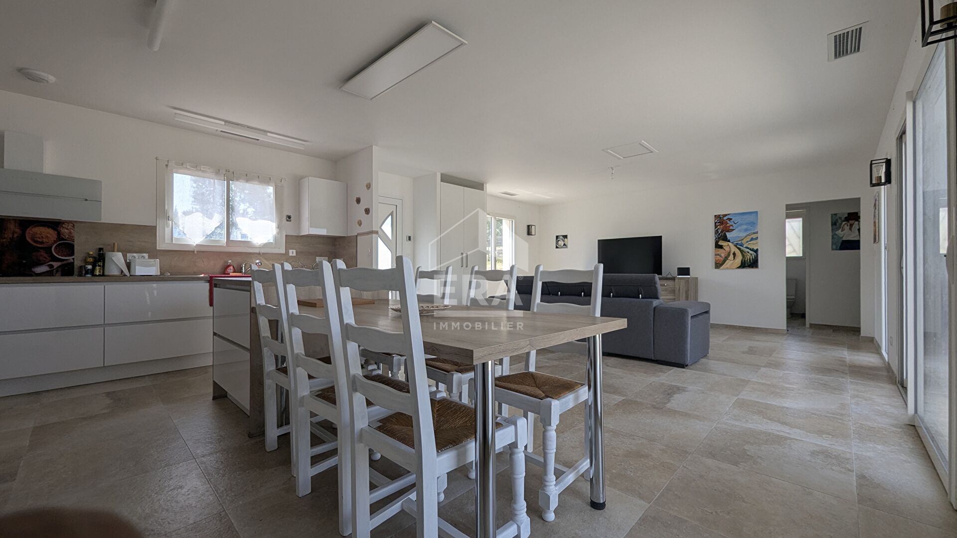 Nouveauté en exclusivité dans votre agence Tendance Immo !Située sur la commune de La Palme, idéalement placée entre Port-La-Nouvelle et Leucate, à seulement quelques minutes des plages, cette charmante maison contemporaine construite en 2023 vous offre environ 89 m² habitables sur une parcelle de 205 m². Au rez-de-chaussée, vous serez accueillis par une vaste entrée, suivie d'une pièce de vie lumineuse de plus de 37 m², comprenant un salon-séjour convivial et une cuisine aménagée et équipée ouverte. Vous y trouverez également une buanderie, un WC indépendant, ainsi qu'un garage carrelé avec porte motorisée, bénéficiant en plus d'une place de stationnement extérieure. À l'étage, la maison propose trois belles chambres toutes équipées de placards, ainsi qu'une salle d'eau moderne avec WC et douche à l'italienne. Les extérieurs ne manquent pas d'atouts : grâce à son exposition Est-Ouest, la maison est traversante et baignée de lumière toute la journée . À l'avant, un espace pratique (terrasse en béton imprimé effet roche) permet de déposer vos effets personnels, tandis qu'à l'arrière, vous découvrirez un jardin intimiste, sans vis-à-vis, agrémenté d'une belle terrasse équipée de deux pergolas en aluminium à lames orientables l'endroit parfait pour profiter de moments de détente en toute tranquillité. Côté confort, la maison se distingue par ses prestations de qualité : climatisation gainable multizone, cumulus thermodynamique, volets roulants électriques et portail automatique du garage. ?? À seulement quelques pas des commerces du village, cette maison récente allie modernité, confort et luminosité, le tout dans un environnement calme et recherché. Une visite s'impose sans tarder !