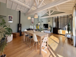 La maison principale offre une vaste pièce de vie de 60m² avec une cuisine moderne ouverte. Vous apprécierez sa très belle hauteur sous plafond, ses poutres apparentes et ses larges baies vitrées donnant sur une agréable terrasse et une piscine. Elle comprend également une buanderie, un WC indépendant, une grande salle de bain, deux belles chambres ainsi qu'une suite parentale avec salle d'eau et dressing. Une dépendance complète ce bien, idéale pour recevoir ou pour un projet locatif. Elle dispose d'une pièce de vie, de deux chambre set d'une salle d'eau avec WC. A l'extérieur, vous profiterez d'un jardin arboré soigneusement entretenu, d'une piscine conviviale et d'un carport permettant de stationner deux véhicules, équipé d'une borne de recharge pour voiture électrique. Un bien rare, alliant confort moderne, tranquillité absolue et proximité immédiate des commodités.
