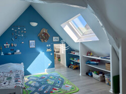 Le deuxième étage accueille deux chambres supplémentaires, dont une avec un espace dédié aux jeux.