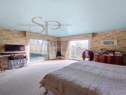 Au rez-de-chaussée, une entrée spacieuse dessert un vestiaire équipé d'un lavabo et de WC. Le salon cathédrale d'environ 50 m², doté d'une superbe cheminée à foyer ouvert et d'une grande baie vitrée donnant sur une terrasse orientée plein sud, offre une vue imprenable sur le jardin. Le rez-de-chaussée comprend également une salle à manger, une cuisine aménagée et équipée, une buanderie, un cagibi, ainsi que deux chambres : l'une avec salle de bain privative et l'autre, d'environ 19 m², également équipée d'une salle de bain et de WC.